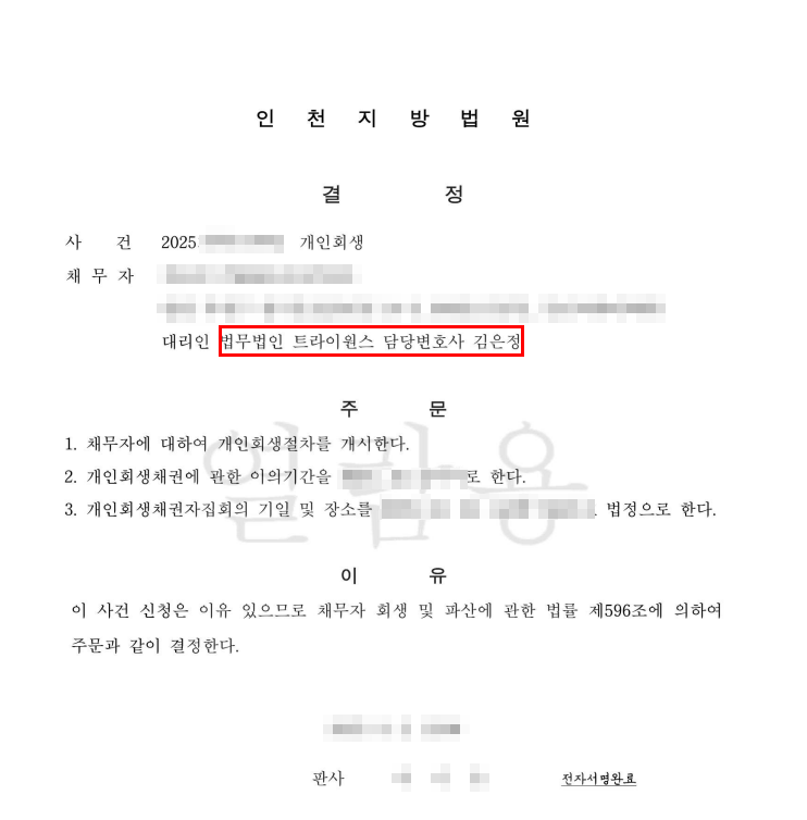 법원은 제출된 자료와 소명 내용을 검토한 후 변제 계획 인가 결정을 내렸습니다. 총 채무 3억 2천만 원 중 약 77%에 해당하는 2억 4천6백만 원이 탕감되고, 잔여 채무는 36개월 분할 변제로 확정되었습니다. 이를 통해 의뢰인은 과도한 채무 부담을 벗어나 사업 지속이 가능한 환경을 확보하였습니다.
