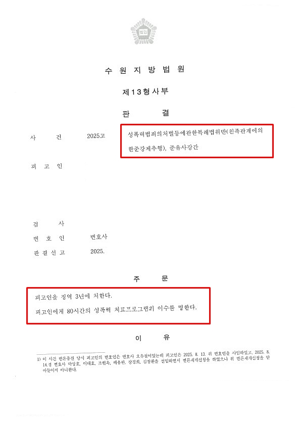 재판부는 제출된 모든 증거와 피해자 진술을 종합하여 K씨의 범행을 인정하였고, 친족준유사강간 범죄로 징역 3년과 성폭력 치료프로그램 80시간 이수를 명령하였습니다.