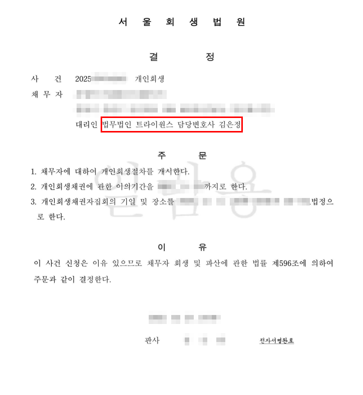 법원은 의뢰인의 소득과 생활 여건, 채무 규모를 종합적으로 고려하여 개인회생 개시 및 변제계획안을 인가하였습니다. 이에 따라 총 채무 약 5천만 원 중 약 75%가 탕감되는 결과가 확정되었습니다.