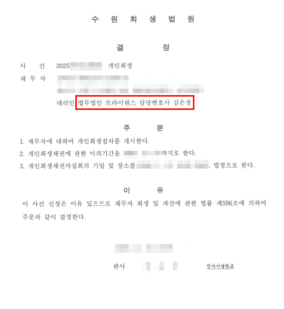 법원은 의뢰인의 소득과 채무 규모, 변제 가능성을 종합적으로 검토한 뒤 개인회생 개시 결정을 내렸습니다. 제출된 변제계획안은 큰 수정 없이 그대로 인가되었습니다.