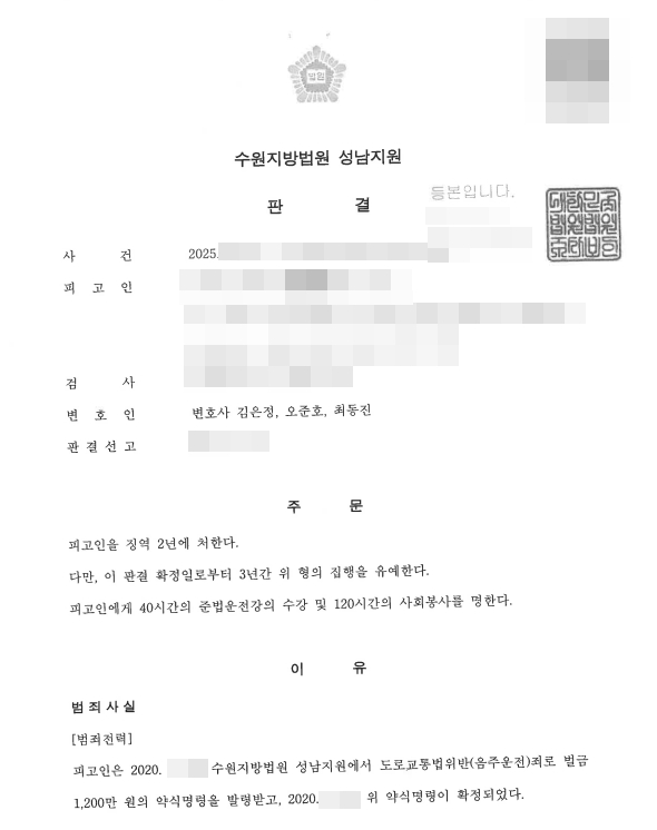 본 사건은 음주 전과가 있는 상태에서 음주측정거부를 한 의뢰인을 조력하여 집행유예로 마무리한 사례입니다.