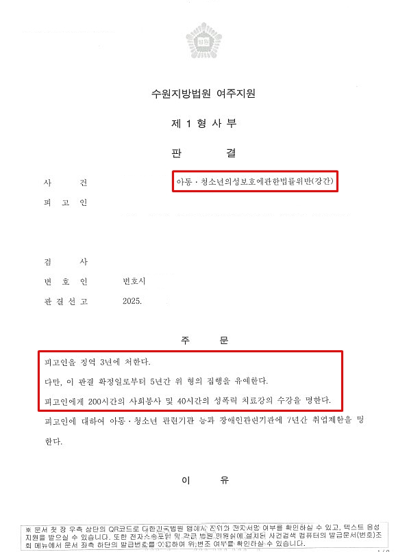 그 결과 B씨는 징역 3년에 처해졌고, 집행유예 5년, 사회봉사 200시간 및 성폭력 치료강의 40시간 수강, 아동·청소년 관련기관 등에 7년간 취업제한 명령을 받았습니다.